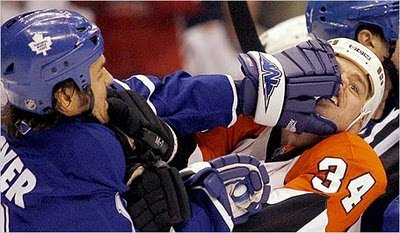 Old school looks like girl's school. It would be hard to imagine the Rangers newest bruiser, Derek Boogaard, teaching the young kids attending his summer hockey fighting camp how to grab someone's hair and use that as leverage for a unfair pummeling.